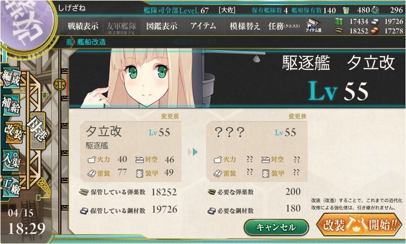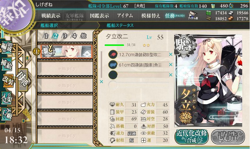 さて、艦これの「夕立」ですが、レベル20で改、レベル55で改二になります。