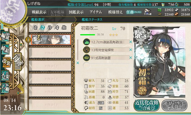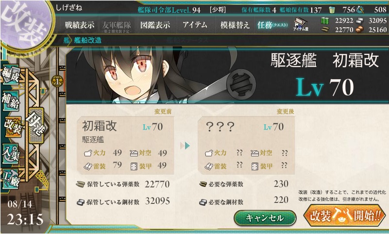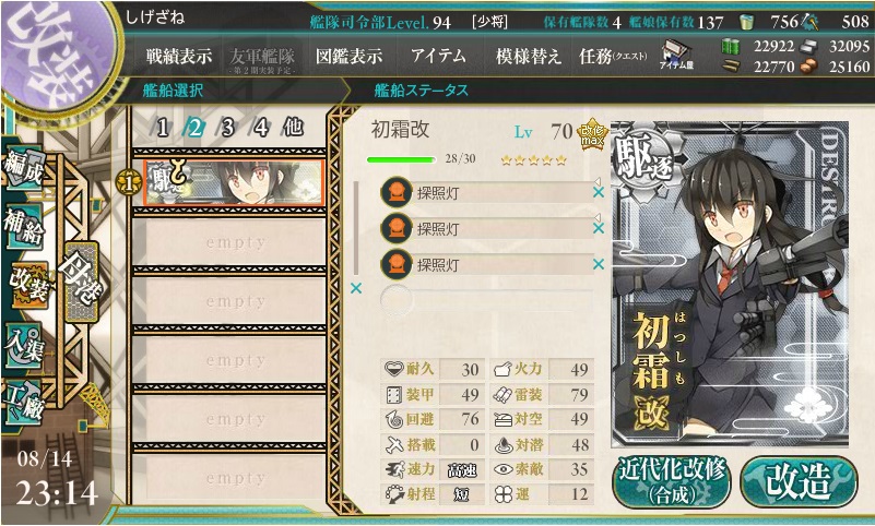 ここにレベル70の「初霜」がおるじゃろ?