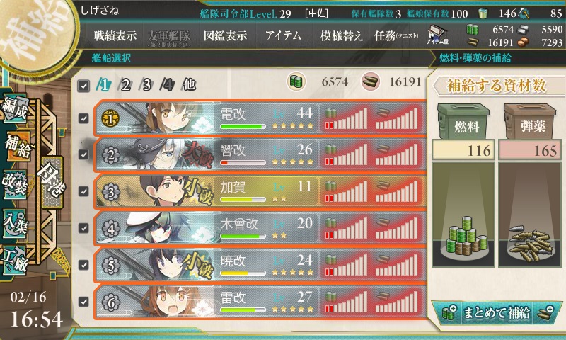 第六駆逐隊「暁」「響」「雷」「電」の出番となります残り2隻は改一までいった木曽と空母の加賀を編成しました。