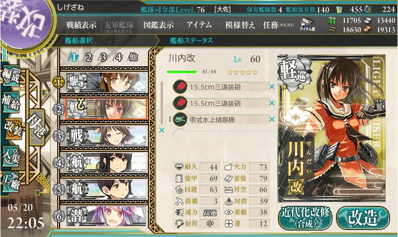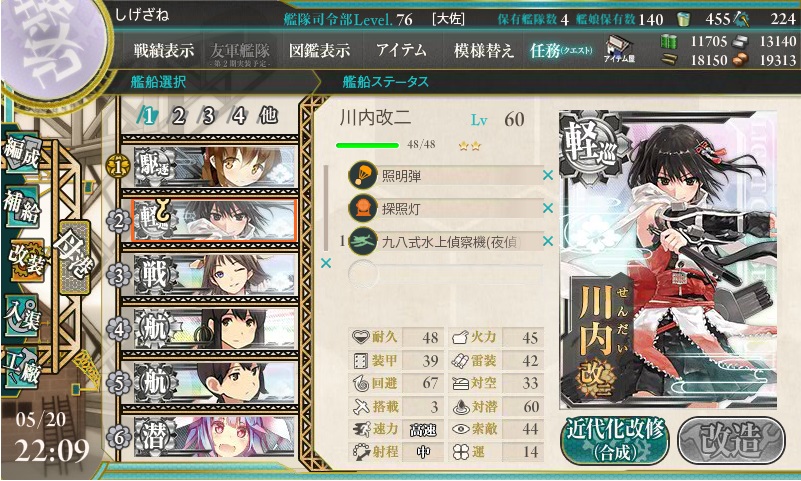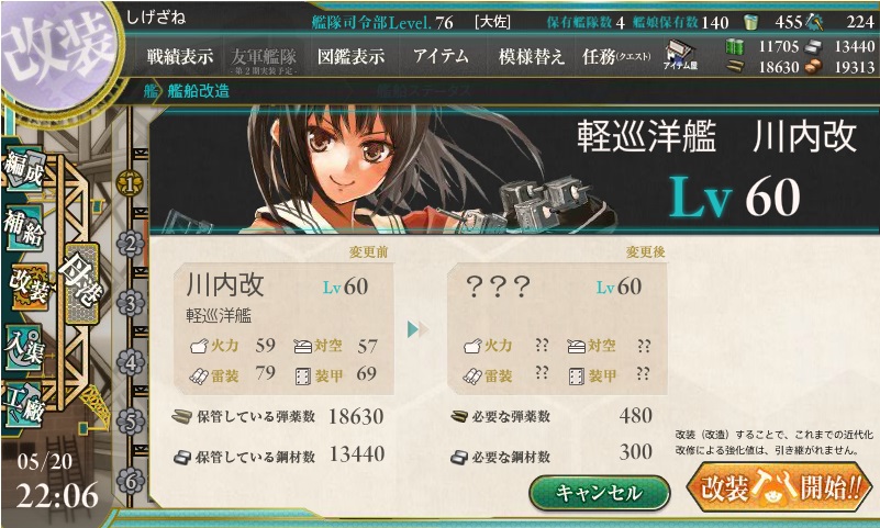 さて、そんな「川内」ですが、レベル20で改、レベル60で改二にできます。