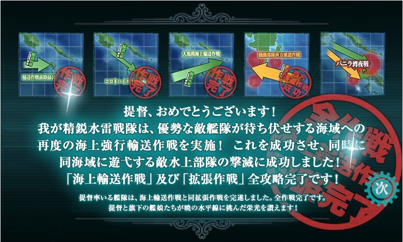 全提督、艦娘、深海棲艦、運営、皆様お疲れ様でした。個人的には艦これ始めた当初から育ててきた駆逐艦が多く活躍できたイベントでとてもとても楽しめました。ただ、今回イベントでも足りない部分は沢山でてきましたので、次回のイベントまで、その分を補うようにしていきます。