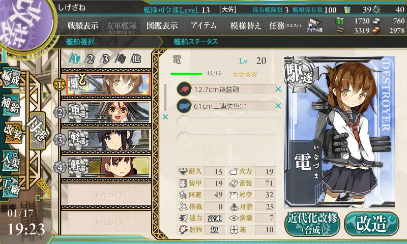 暁型4番艦駆逐艦『電』こと電ちゃんですが、はじめた当初から第1艦隊のトップを張っており、この度、ようやく改造できるまでのレベルに到達いたしました。