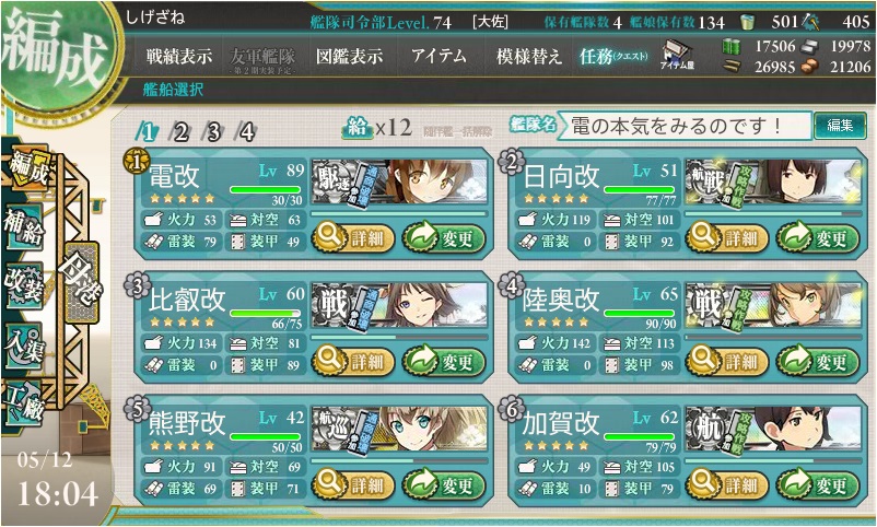 なので、日向・熊野と水上爆撃機「瑞雲」を載せられる艦を編成し、加賀には艦戦ガン積みで制空権の確保を狙いました。