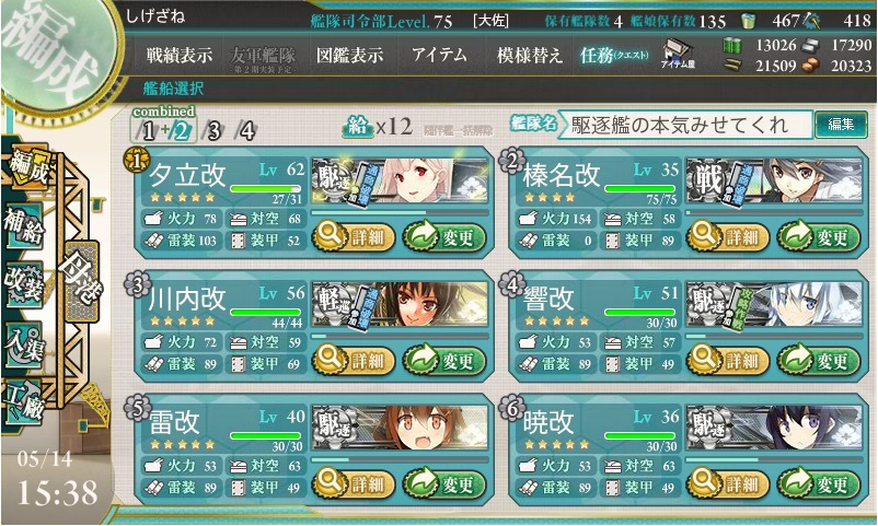 9戦目は装甲の薄い雷巡が大破することによる撤退が多かったこともあり、以下の編成で挑みました。