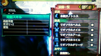 G級でも同じことが予想され、上位リオソウルからG級装備へと変えようと思ったのですが、装備作りがメンドクサイ+つなぎ装備作っても直ぐにレウス装備を作ることから、上位防具そのままで挑みました。