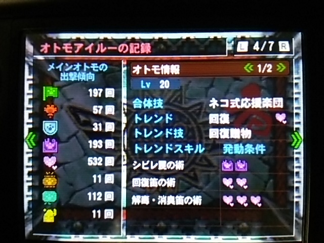 合体技「ネコ式応援楽団」は体力の上限も上がるので、猫飯が揃ってない序盤はとても有効でした。そのせいもありますね。