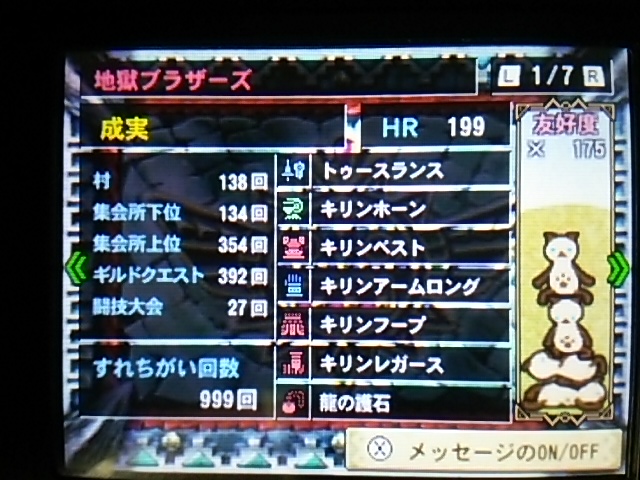 ファーストキャラの見納めになります!!頑張って作ってきた装備出会ってきたハンターさん達のギルドカード雇用していたオトモアイルーこれらとも、お別れになります。名残惜しいですが、別れは始まりでもあります。新たな舞台「MH4G」への、新たな旅立ちに向けてのお別れです。ハンター「成実」と共に狩りをしてくださった方々には感謝のしようがありません。ホントに、ホントにありがとうございました!!ヽ(´∀`)ノ新たな舞台「MH4G」でも、何卒よろしくお願いいたしますm(_ _)mでは、これで、MH4最後の記事を締めくくりたいと思います。皆様、MH4Gでも一生モンハンやろうぜ!では ノシ